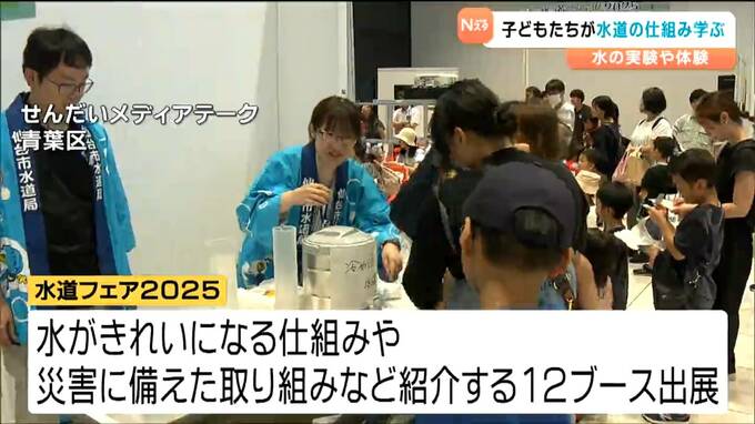 仙台市青葉区のせんだいメディアテークで開かれた「水道フェア2025」には、水がきれいになる仕組みや災害に備えた取組みなどを紹介する12のブースが並びました。