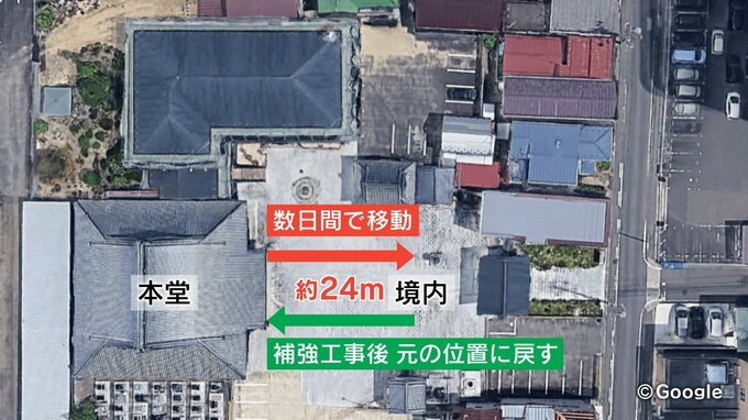 境内の方向にはローラーが付いたレールが敷かれていて、重さ120トンの本堂を油圧ジャッキで押して動かします。その手法は至ってシンプルですが、移動には、ミリ単位の精密さが求められます。