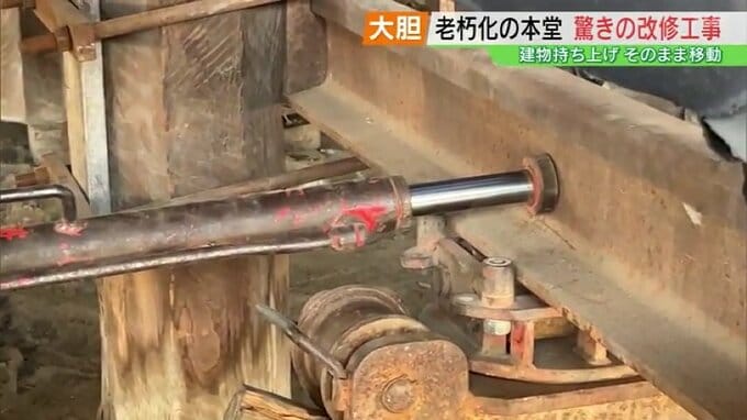 井上アナ「特別に許可を頂き、本堂の中にいます。こちらの油圧ジャッキを使って、ゆっくりと本堂を建物ごと押していきます」