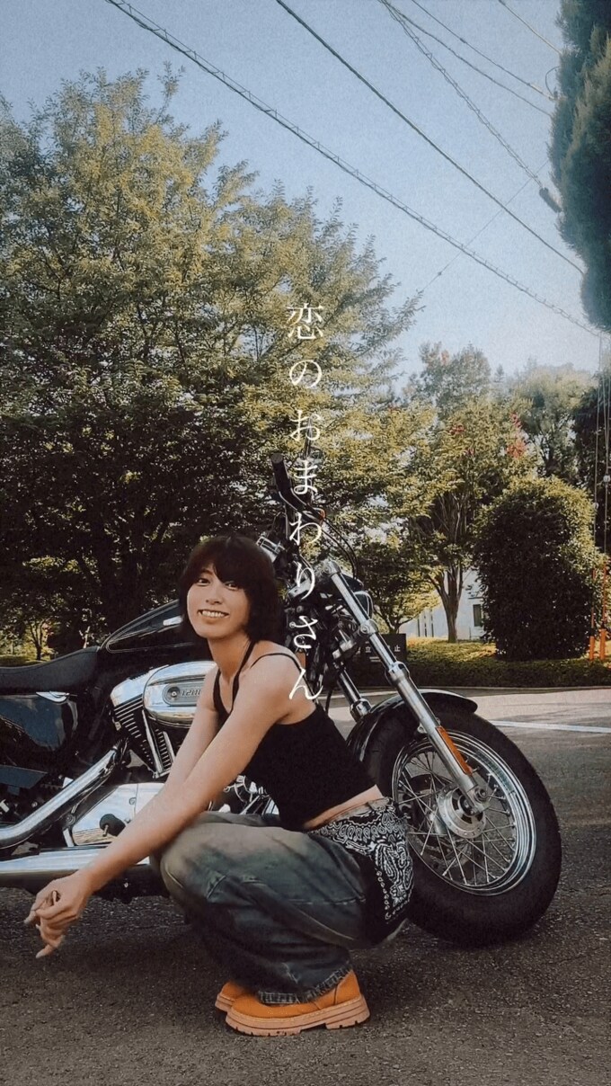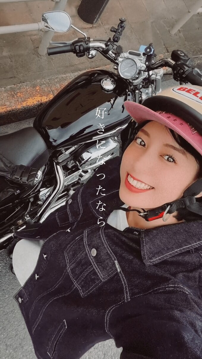 笠井さんは、今までに投稿した静止画や動画を集めて1本の動画にして投稿。へそ出しデニムにバンダナ姿でハーレーのそばにしゃがみこむカットや、Tシャツ姿でハーレーに跨がってチョークをひねるカット、デニムのジャケットにヘルメット姿でハーレーと自撮りするカットなど、豊かな表情を投稿しています。
