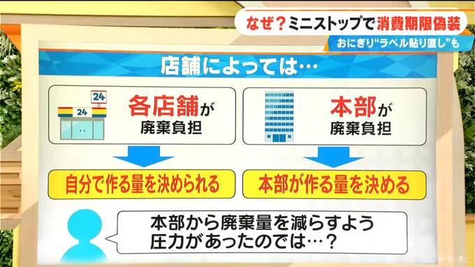 各店舗が廃棄を負担する加盟店になると、自分で作る量を決めることができる。廃棄するのも自分負担になるが、作る量も決められる。一方、本部による直営店の場合は本部が作る量を決める。廃棄負担も本部だから本部に裁量権がある。取材した方によると、「本部から廃棄量を減らすように圧力があったのでは…?」ということですが…