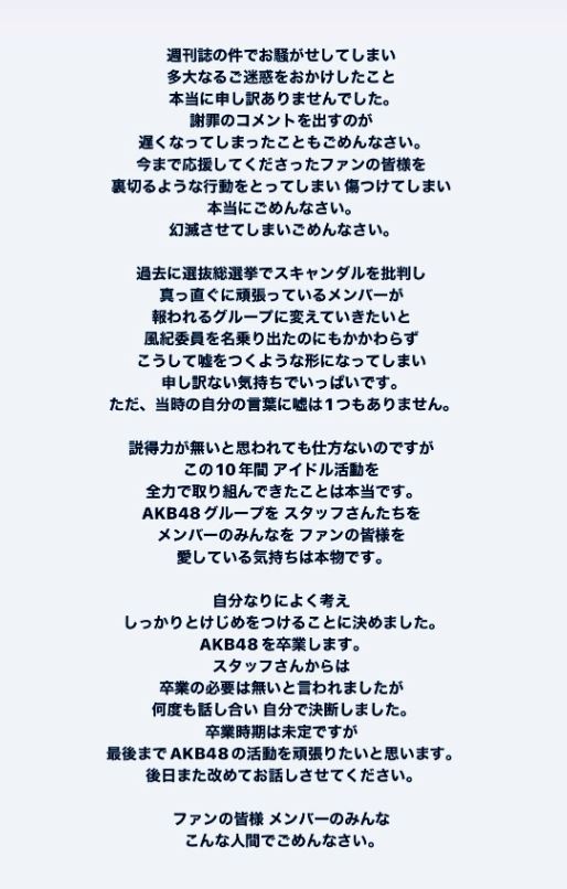 岡田さんは「今まで応援してくださったファンの皆様を 裏切るような行動をとってしまい傷つけてしまい 本当にごめんなさい。幻滅させてしまいごめんなさい。」と綴り、「過去に選抜総選挙でスキャンダルを批判し 真っ直ぐに頑張っているメンバーが 報われるグループに変えていきたいと 風紀委員を名乗り出たのにもかかわらず こうして嘘をつくような形になってしまい 申し訳ない気持ちでいっぱいです。」と、その胸の内を明かしています。