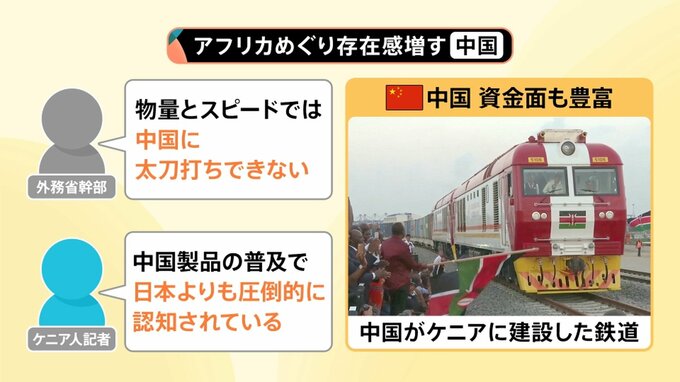 中国がアフリカに対しても存在感を増しているなか、外務省幹部は「物量とスピードでは中国に太刀打ちできない」と話しています。現地のケニア人記者は、「中国製品の普及で、日本よりも圧倒的に認知されている」とも話していました。