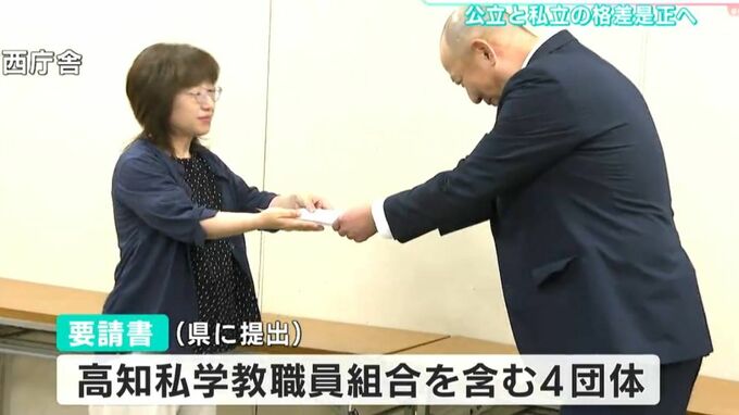 県に要請書を提出したのは高知私学教職員組合を含む4つの団体です。4団体は県が私立に通う高校生を対象に授業料の一部を支援していることに一定、理解を示していますが、施設設備費など授業料以外の負担が残っています。このため要請書には「県の補助対象を施設設備費まで拡充」することや「入学金補助制度の創設」など5つの項目をあげています。このあと団体は県庁で会見を開き、高知の特徴を踏まえた上で公立と私立の格差是正を訴えています。