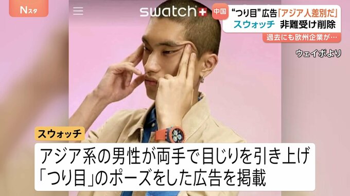 スイスの時計ブランド「スウォッチ」が掲載した広告をめぐり、「アジア人差別だ」と中国で非難の声があがっています。スウォッチは、アジア系の男性が両手で目じりを引き上げ、「つり目」のポーズをした広告を掲載…