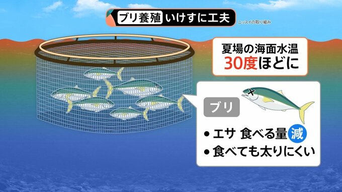 ブリ・カンパチの養殖について、ニッスイの担当者に取材したところ、「台風などの波浪対策が、近年の水温上昇への対策にも役立っています」と話していました。