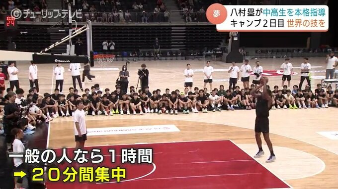 あの八村選手の額にも大粒の汗。子どもたちも真剣な表情で見つめていました。