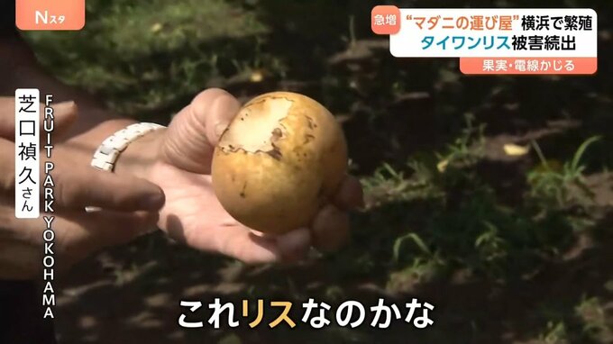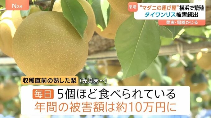 こちらの農園では、去年からタイワンリスが原因とみられる被害が。先月末から、収穫直前の熟した梨が毎日5個ほど食べられ、年間の被害額はおよそ10万円に。