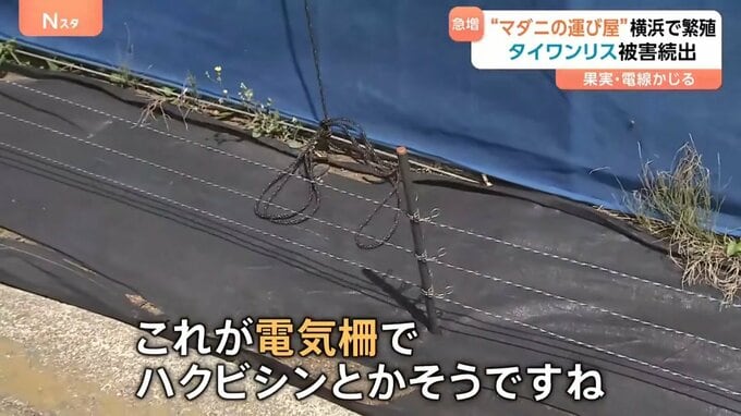 「これが電気柵で、ハクビシンとかそうですね。リスは小さすぎちゃって防ぎようがないですよね」