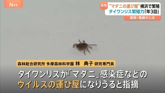 森林総合研究所・多摩森林科学園の林研究専門員は、タイワンリスが「マダニ」感染症などのウイルスの運び屋になり得ると指摘します。