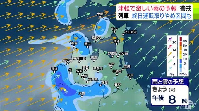 【大雨情報】青森県「津軽」で大雨の見込み 20日までの24時間の予想降雨量が津軽…120ミリ 下北と三八上北…80ミリ 前線が日本海から津軽海峡付近に停滞か【雨と雲の予想シミュレーション】 青森テレビ 2025年8月19日(火) 21:20 国内 【青森県版】19日夜の雨と雲の予想シミュレーション ※きょう=19日