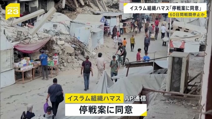 パレスチナ自治区ガザでの戦闘をめぐり、イスラム組織ハマスが停戦案に同意したとAP通信が報じました。また、複数メディアによると、停戦案は戦闘を60日間停止し、その間、ハマスが生存している人質のうち半数を解…