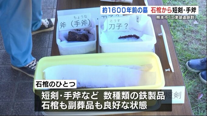 今回の調査で発掘された石棺のひとつには、短剣や手斧など数種類の鉄製品が入っていて、石棺も副葬品も良好な状態で残っているのは貴重だということです。