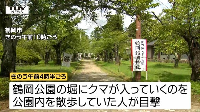 警察によりますと、きのう午前4時半ごろ、鶴岡市馬場町の鶴岡公園の堀にクマが入っていくのを公園の中を散歩していた人が目撃しました。