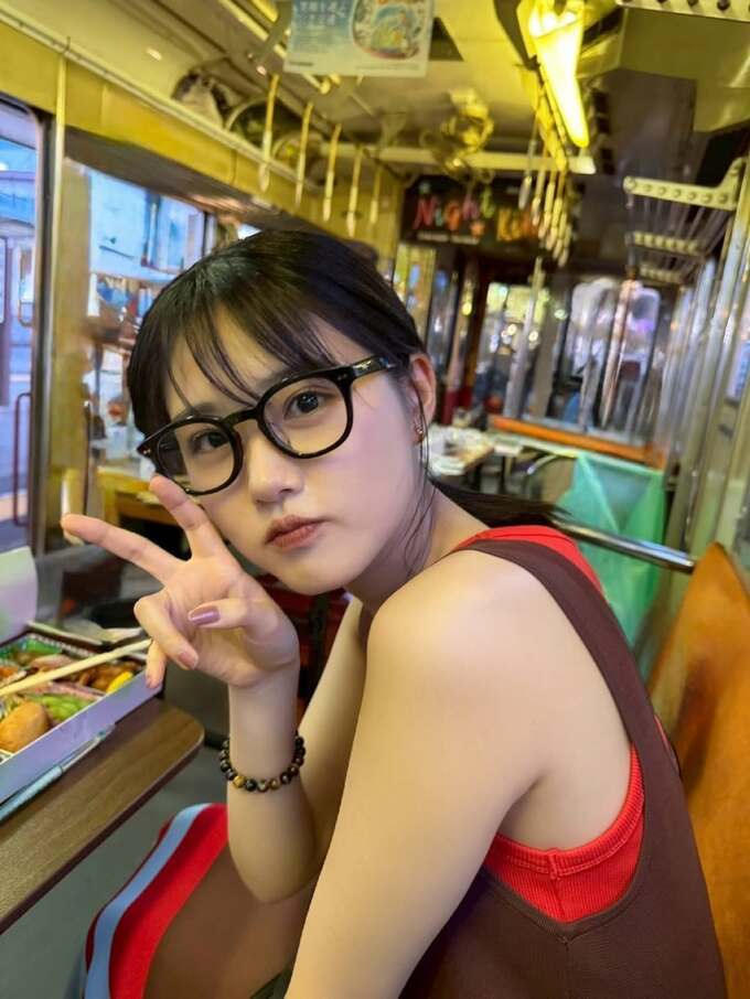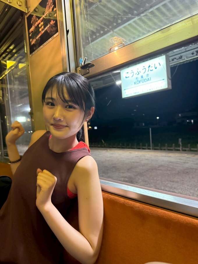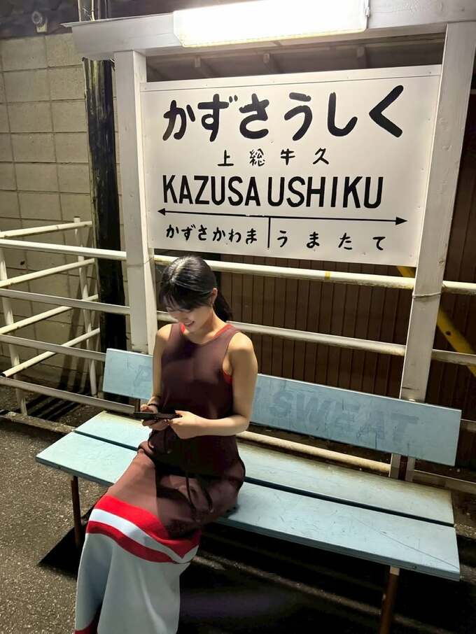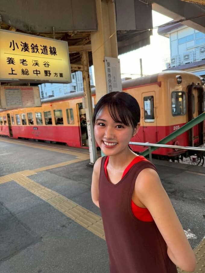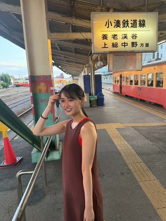 投稿された画像では、原菜乃華さんが、小湊鐵道の駅のホームで車両をバックに微笑む姿や、車両内でくつろぐ様子などが見て取れます。