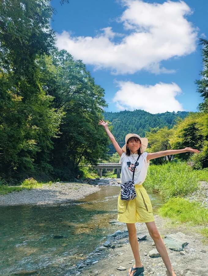 また別のショットでは、広々とした川辺で腕を広げてポーズをとる若槻さん。白いTシャツと黄色いショートパンツを身につけ、帽子をかぶった爽やかな夏のコーディネートです。周囲の緑豊かな木々と青空が、夏の開放感を一層引き立てています。