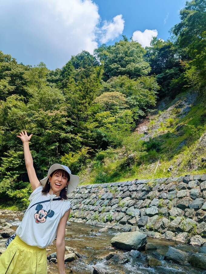 投稿された写真には、白いTシャツにミッキーマウスのデザインが施されたトップスを着て、清流のそばで楽しそうに手を振る若槻さんの姿が。背景には青空が広がり、緑豊かな自然の中でリラックスした表情を見せています。