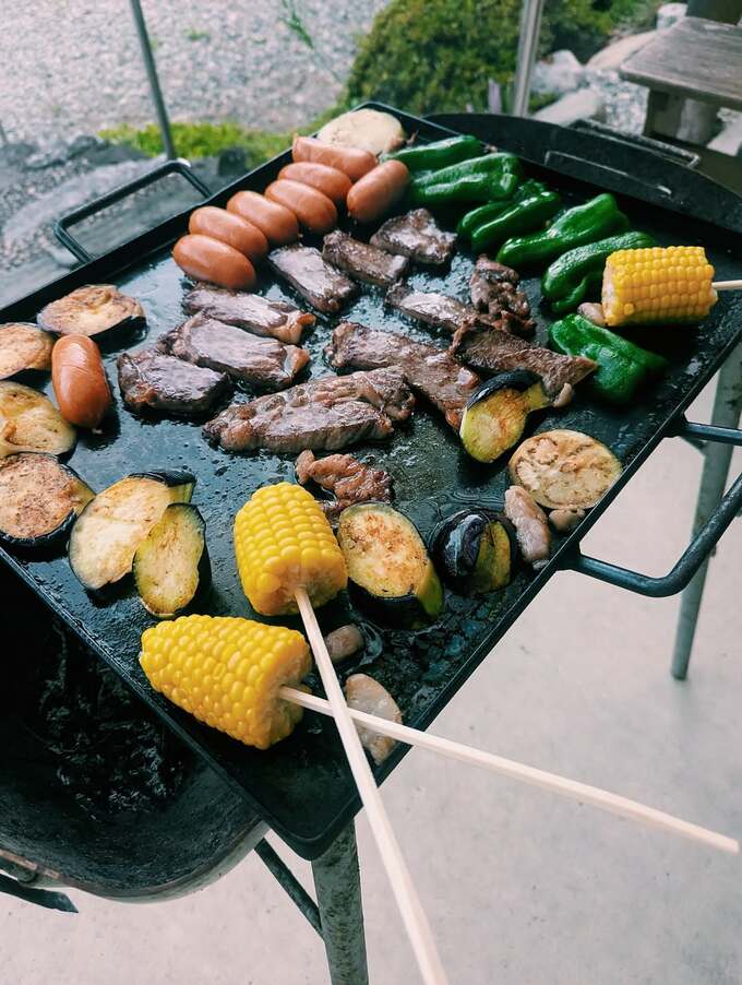 バーベキューの様子も投稿されており、グリルの上ではジューシーなステーキ、プリッとしたソーセージ、鮮やかな緑のピーマン、香ばしく焼けたナスなど、多彩な食材が調理されています。とうもろこしは串に刺され、アウトドア料理の醍醐味が伝わってきます。