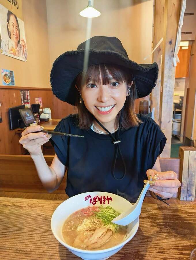 食事の楽しみも満喫した様子で、黄色いスイカのカットが白い皿に並べられた写真や、レストランでラーメンを楽しむ若槻さんの笑顔も投稿されています。黒い帽子と黒い服を着て、箸を持ちながら明るく微笑む姿が印象的です。