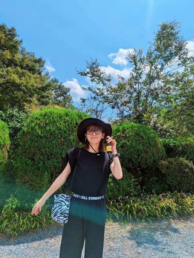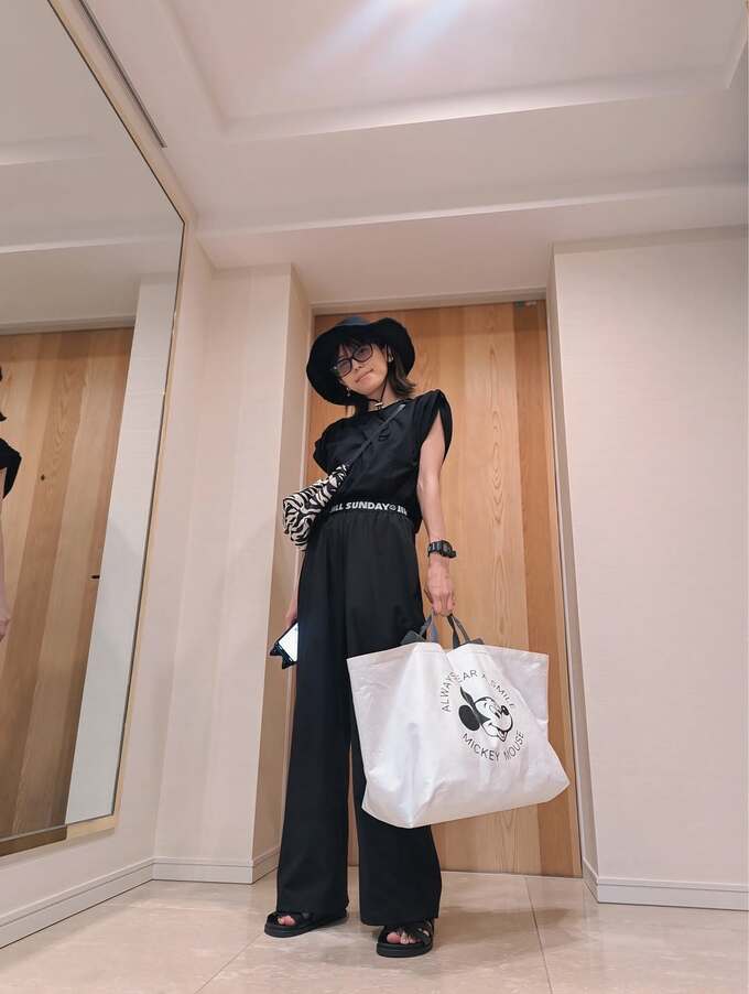ファッションにもこだわる若槻さんは、黒いハットとサングラス、黒いトップスとズボンというコーディネートで庭園のような場所でポーズをとったり、黒いワンピースに「ミッキー」のイラストが描かれた大きな白いバッグと、ゼブラ模様の小さなバッグを持った室内ショットも公開しています。
