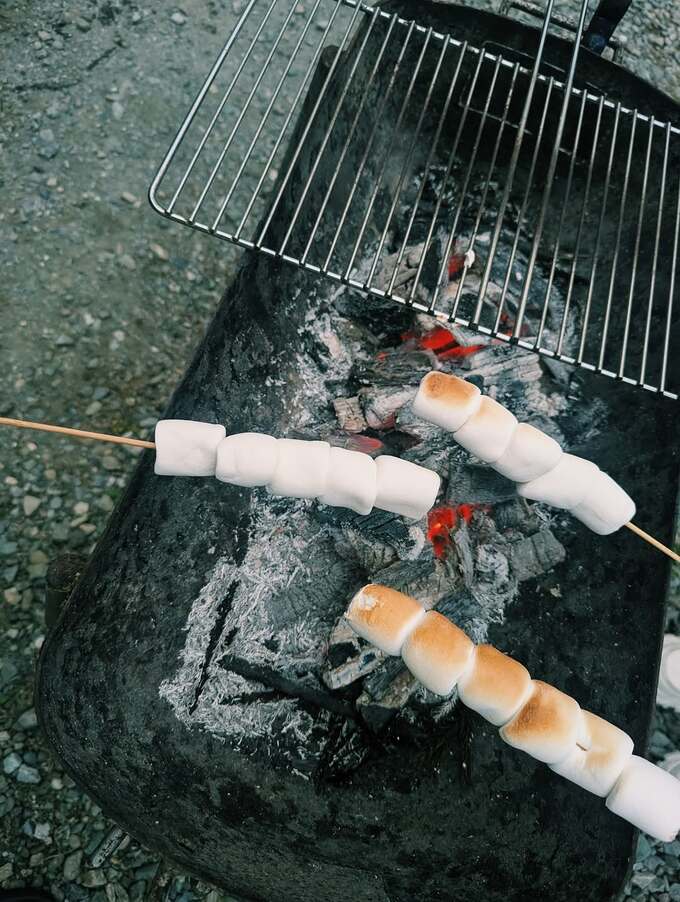 デザートには、焚き火の後の炭で熱せられたグリルの上で、串刺しのマシュマロを焼く様子も。キャンプならではの光景です。