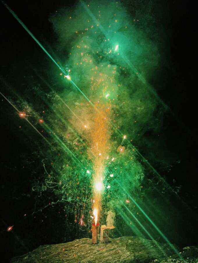 さらに、白い帽子とシャツを着た若槻さんが、虫よけを片手に花火のセットを掲げる写真も。夜には実際に花火を楽しんだ様子が写されており、緑とオレンジの光が夜空に輝く様子が印象的です。