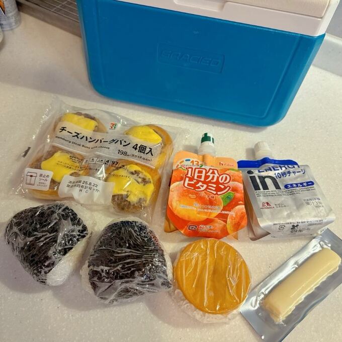 また翌日の投稿では、息子さんの部活動に向けた補食の準備を紹介。「連日朝から部活の長男!写真は、お昼ご飯までの補食です」とコメントしています。おにぎり、チーズハンバーグパン、ビタミンゼリー、チーズなどを青いミニクーラーボックスに詰めた様子を写真に収めています。
