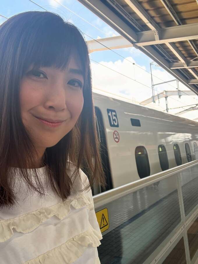 根本さんは、新大阪駅のホームで自撮りをした画像とともに「さて、どこに向かってるでしょーか @新大阪 きっと当たらないと思います(新幹線)の乗り換え中。。」というコメントを添えていました。写真には白いフリルのあるトップスを着た根本さんの背後に15番車両と表示された新幹線が停車している様子が映っています。