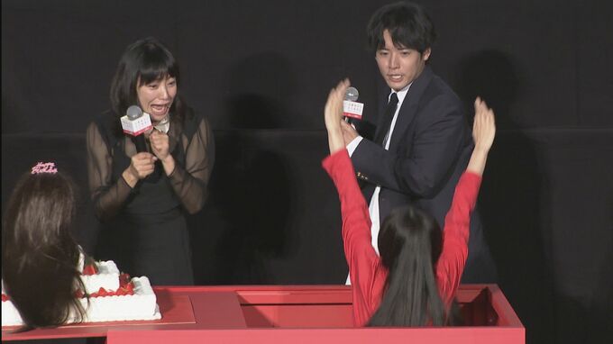 さらに司会から写真撮影のためにケーキに近寄るように案内されると、ケーキの台の中から「赤い女」の幽霊が出現。菅野さん、赤楚さんをはじめ、会場中が悲鳴と笑いに包まれました。赤楚さんも “ああ、ビックリしたー!俺がビビっちゃった” と衝撃を受けた様子。菅野さんが笑いながら「赤い女」とハイタッチすると、再び客席は笑いに包まれました。