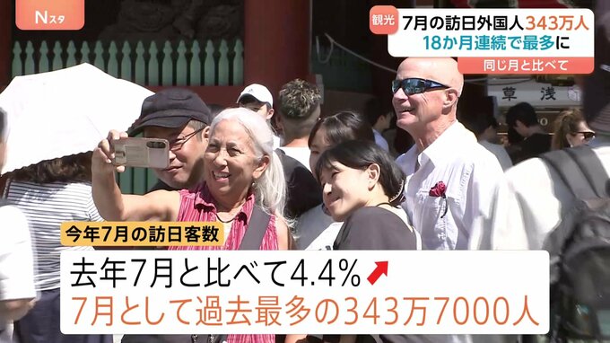 先月(7月)に日本を訪れた外国人旅行者数は343万人に上りました。これで同じ月と比べて過去最多となるのが18か月連続で更新されました。政府観光局によりますと、今年7月に日本を訪れた外国人旅行者数は去年7月と…