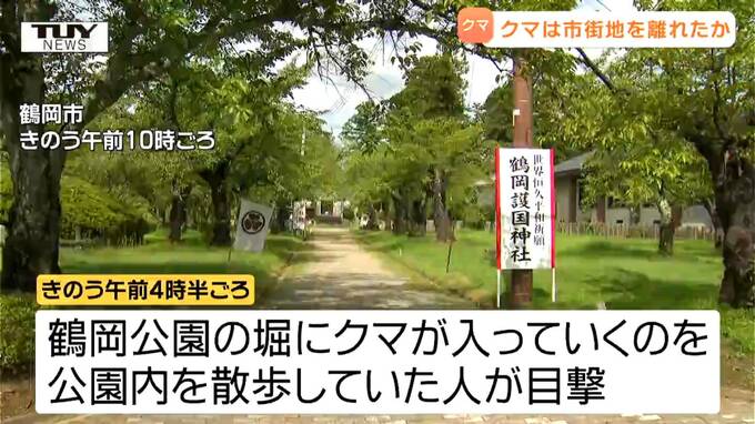 市や警察によりますと、クマはきのう午前4時半ごろ、鶴岡市馬場町の鶴岡公園の堀にクマが入っていくのを公園の中を散歩していた人目撃しました。