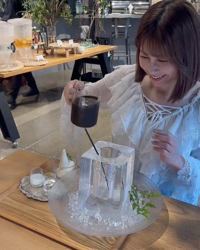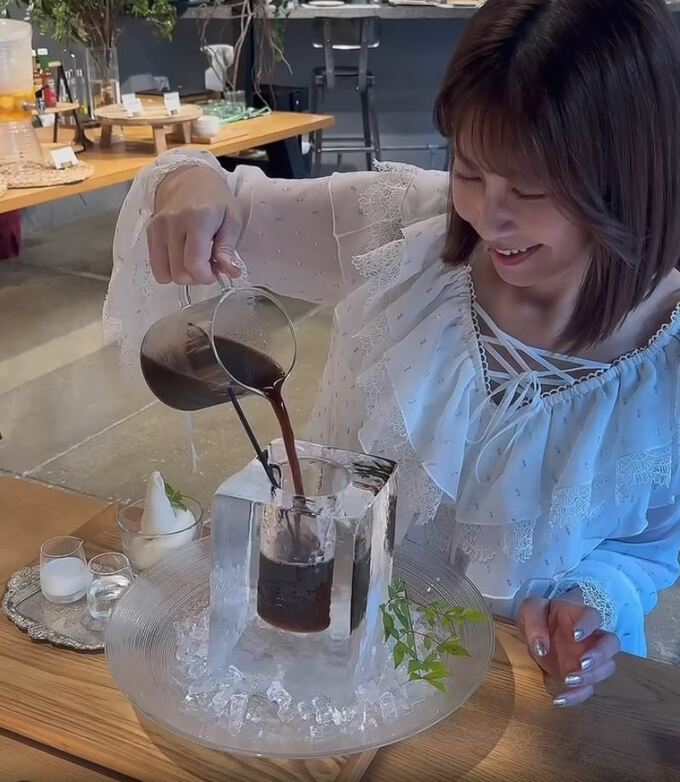 訪れたのは広島にある「ニューヨークニューヨーク広島」というカフェ。投稿されている動画では、四角い氷の塊に穴が開けられた特別な器にコーヒーが注がれていく様子が映し出されています。この氷の器は見た目にも涼しげで、暑い夏にぴったりの演出となっています。