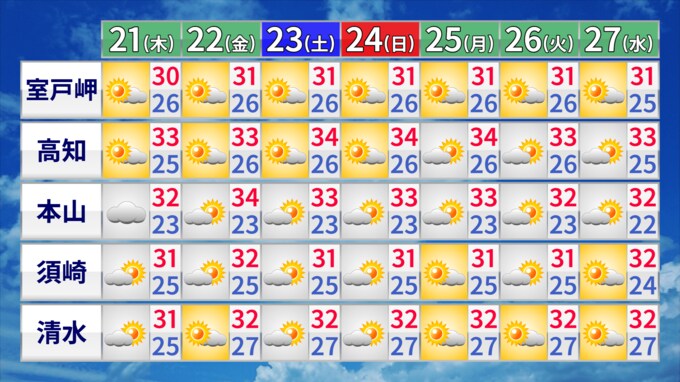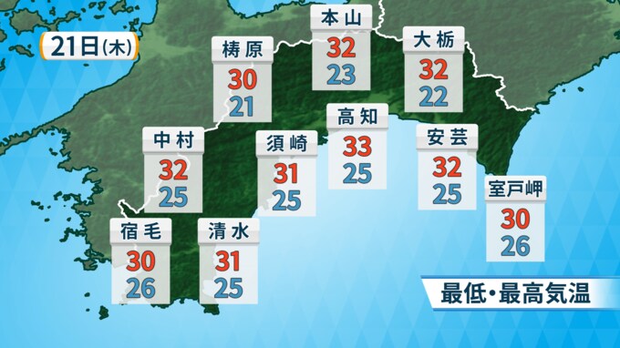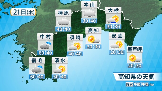 21日の高知県内は、高気圧に覆われて概ね晴れますが、湿った空気や日射の影響で、雨や雷雨となるところがあるでしょう。明け方から夕方にかけて激しい雨の降るところがある見込みです。