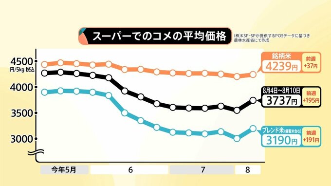 8月4日〜10日のスーパーでのコメ(5キロ)の平均価格は、前の週から195円増えて、3737円となりました。この価格は銘柄米とブレンド米の平均です。