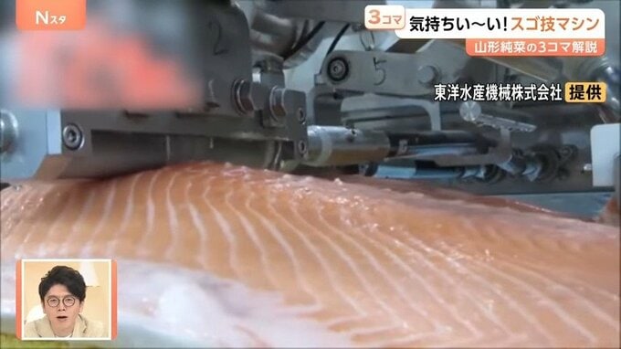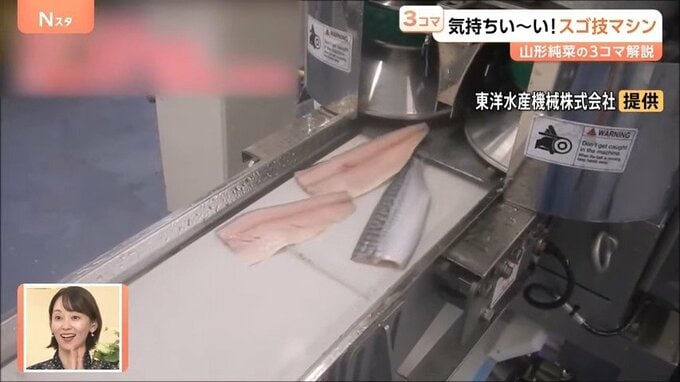 内臓もそのまま魚を丸ごとマシンの中へ入れると、ベルトコンベアで流れていき、頭や尻尾が切り落とされて、あっという間に3枚におろされるというものです。