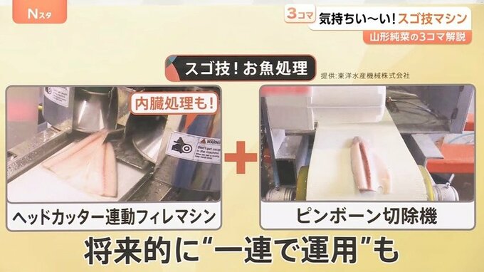 将来的には「ヘッドカッター連動フィレマシン」と「ピンボーン切除機」は、“一連で運用”できるように開発したいということです。