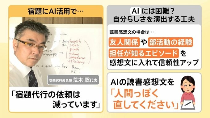 AI活用が広がる中、宿題代行業者は今どうなっているのでしょうか。「宿題代行救急隊」の荒木聡代表によると、宿題代行の依頼は確実に減ってきているそうです。