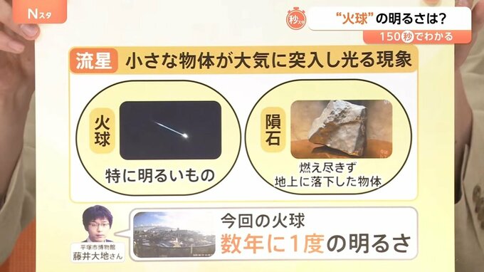 平塚市博物館の藤井大地さんによると、「今回の火球は数年に1度の明るさ」で、火球の中で特に明るいものだといいます。