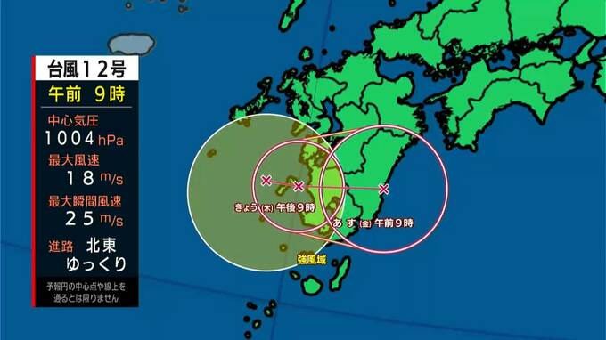 気象台によりますと、台風12号は午前9時現在薩摩川内市の西およそ90キロの海上にあって、ゆっくりと北東に進んでいます。