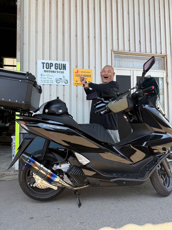 今回のツーリングはバイクショップからスタート。店舗の看板の前で、愛車のPCX160とともに、満面の笑みを浮かべてポーズを決める画像を投稿。