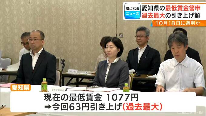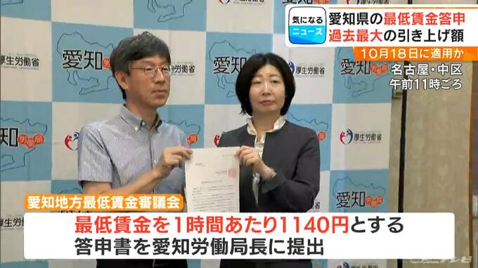 愛知県の最低賃金を決める審議会は、きょう午前、県内の最低賃金を1時間当たり1140円とするよう答申書をまとめ、愛知労働局長に提出しました。現在の愛知県の最低賃金は1077円で、今回の63円の引き上げは過去最大となります。