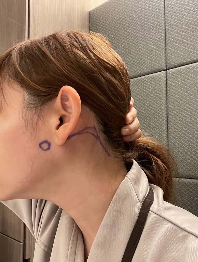 その投稿の中で翔子さんは「顔面麻痺の可能性が高い手術」「めちゃくちゃ怖かったですが乗り越えて今があります。」と振り返り「顔の、深い部分にあった4センチ超えの腫瘍」「神経がからまっていたのに麻痺が出なかった!」「ゴッドハンドな先生の腕に感謝します」と思い返し、左耳の下に描かれた手術のためのマーカー線の写真も合わせて投稿しています。