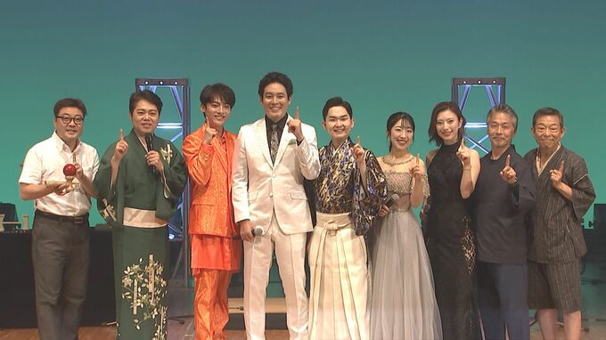 演歌歌手の三山ひろしさんが企画した、芝居と歌のステージ「1PPO〜歌と芝居の贈り物〜」が初日を迎え、三山さんのほか、津吹みゆさん、辰巳ゆうとさん、藤井香愛さん、彩青さん、木村徹二さん、三山さんのけん玉の師匠・けん玉ちばちゃん、そして俳優の山口良一さんが登壇しました。