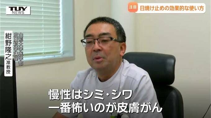 山形大学医学部 皮膚科学講座 紺野隆之 准教授「急性は日焼けとか目がちかちかするような角膜の炎症。慢性はシミ・しわ、一番怖いのが皮膚がん」