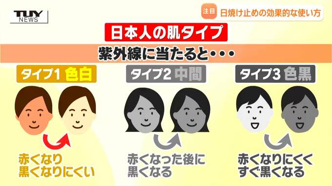 まず、紫外線に当たると赤くなり、黒くなりにくい「色白タイプ」。次に、赤くなった後に黒くなる「中間タイプ」。そして、赤くなりにくく、すぐに黒くなる「色黒タイプ」です。