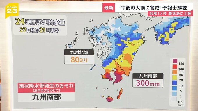 22日夕方までに予想される24時間雨量は、多いところで薩摩地方で300ミリ、大隅、種子島・屋久島地方で200ミリです。土砂災害などに厳重な警戒が必要です。