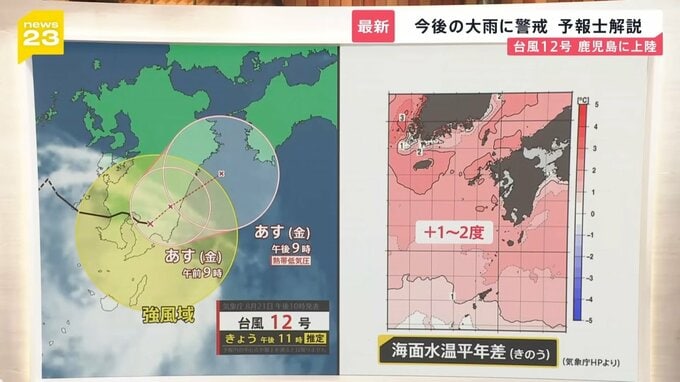 なぜ、このようなことになったのかというと、実は急に発達したのには理由があります。海水温が30度ぐらいあるんですけれども、平年よりも1~2度高くなっています。この1度というのが重要になってくるので、急激に発達しました。