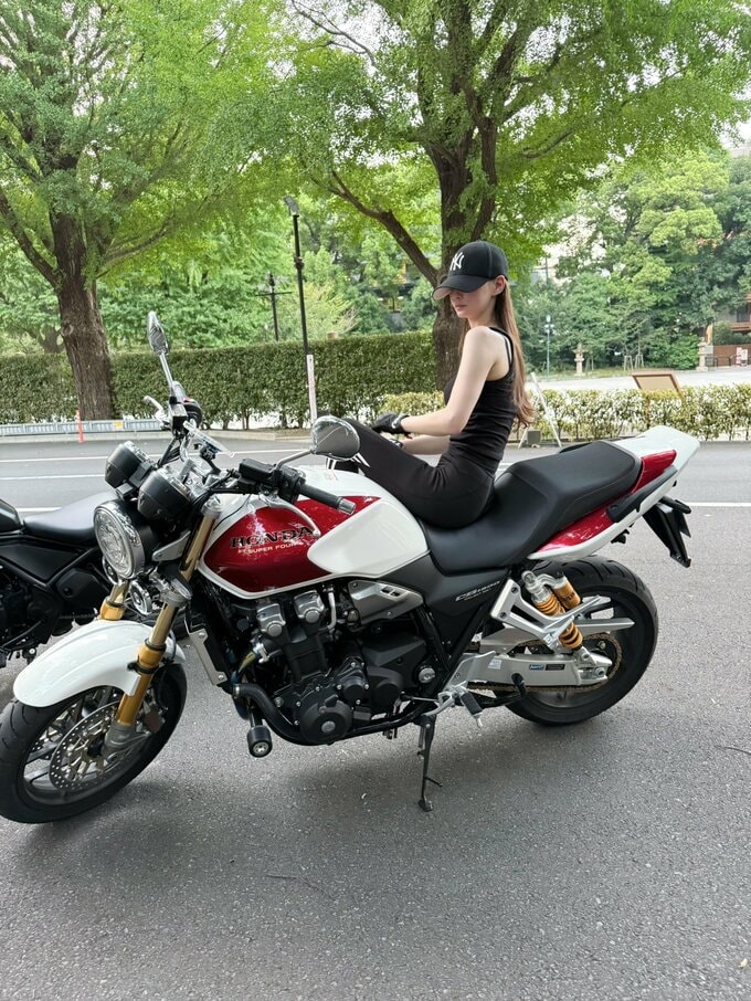 写真からは、ダレノガレさんが黒いキャップと黒いタンクトップを着用し、白と赤のカラーリングのバイクHONDA CB1300 SUPER FOUR SP Final Editionに座っている姿が確認できます。緑豊かな自然の中でのツーリングを楽しんでいる雰囲気が伝わってきます。