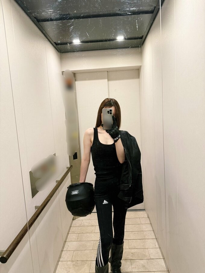 エレベーター内での自撮り写真も公開されており、ダレノガレさんがヘルメットを手に持ち、バイクジャケットを腕にかけている様子が写っています。黒いタンクトップとパンツという、バイクに乗るためのスタイリッシュな装いが印象的です。