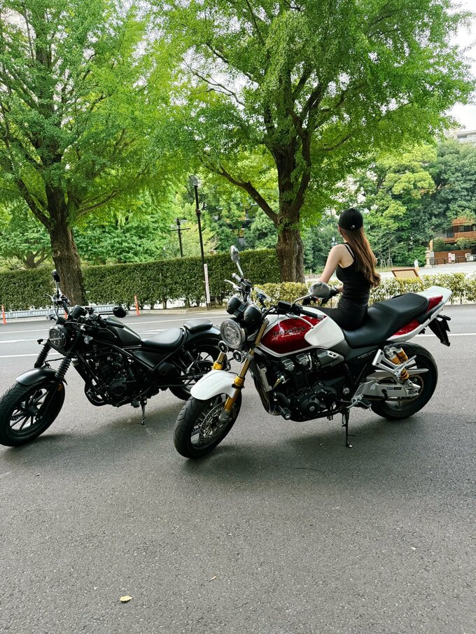 また別の写真では、2台のバイクが並んで停車している様子も公開されています。1台は黒色のバイクHONDA Rebel 500、もう1台は赤と白のカラーリングのバイクHONDA CB1300 SUPER FOUR SP Final Editionです。